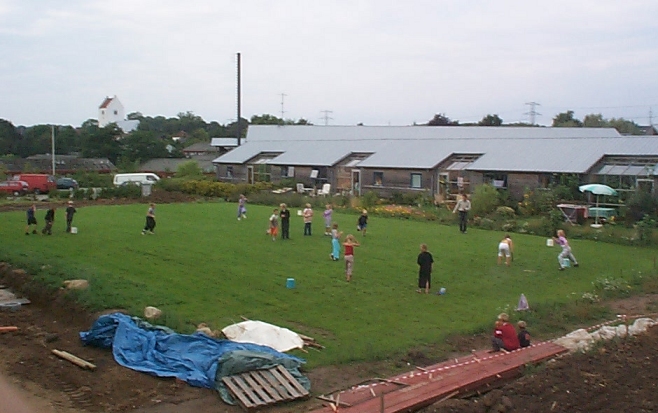 'Rundbold' | Children playing in front of part of the rental units of the Ecovillage, build through a special Danish scheme for social housing. Notice the chimney in the back for the central bio-mass heating system |
